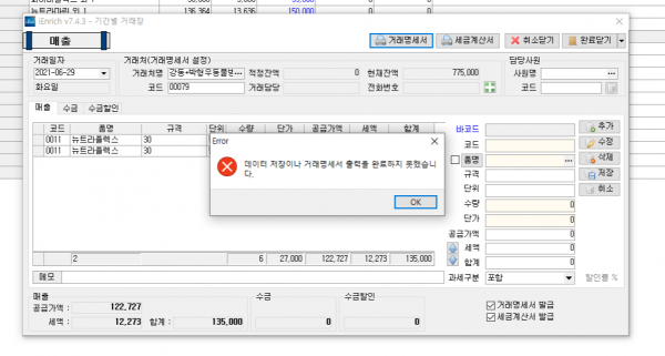 ​거래명세서 출력시 2장씩 한번에 출력이 될때도 있고 첨부파일처럼 에러 메세지가 떠서 로그아웃후 다시 로그인 해야되는 경우가 생깁니다. 이유가 몰까요?