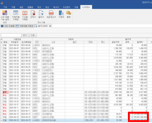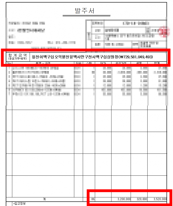 발주서 작성시 작성한 합계액과 인쇄할 합계액이 상이하여 문의 드립니다.