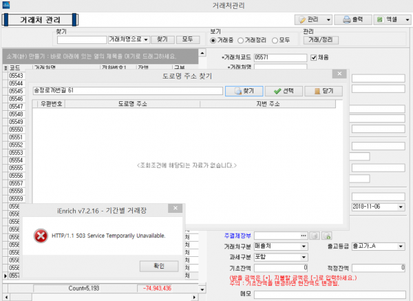 근데, 거래처 등록을 하려고 우편번호를 찾으려고 검색하면 다운 됩니다.