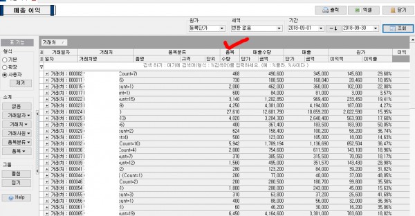 매출이익에보면 품목분류, 품목, 품목수량 등등.... 에서