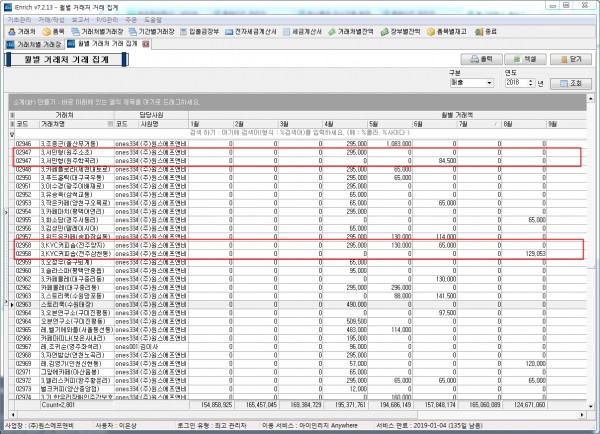 최근 업데이트 후에(표기능이 추가된), '월별 거래처 거래 집계' 에서 같은 코드(업체)가 중복되어 나타나고 있습니다!