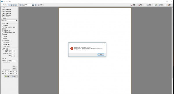 환경설정에서 40줄 전용양식지로 바꾸었는데도 안되고 에러 창만 뜨고