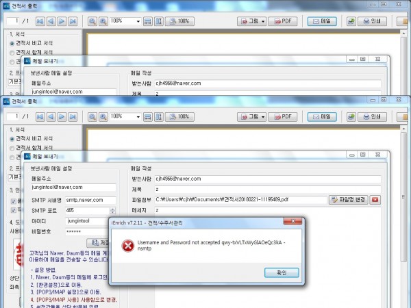 거래명세서 메일보내기가 안됩니다. 설정은 다해놨는데 이렇게 떠요