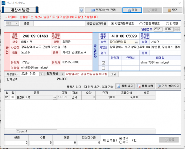 세금 계산서나 계산서 작성은 되나 저장이 되지 않습니다