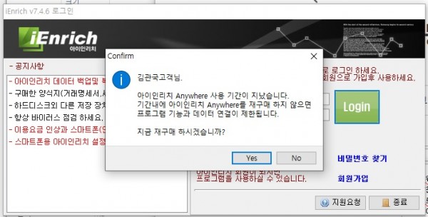 상담원 통화 시 애니웨어 사용기간이 남아 기간만료 후 변경요청 드렸는데 금일 로그인 시 까지 엔터프라이즈로 변경이 안된 듯 보입니다.