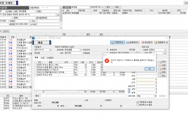 기간별 거래장에서 거래명세서를 클릭하고 확인 한 후 닫기를 누르고 나와서 다시 다른업체의 거래명세서를 들어가서 거래명세서를 누르면 사진과 같이 나옵니다. 계속 그러는 건 아니고 어쩌다 누르다 보면 나오는데 이렇게 나오면 아이인리치 자체를 껏다 켜야하고 불편함이 계속되네요. 프린터는 모두 잘 설정되어있고 컴퓨터를 재부팅해도 사진과 같은 오류가 나오면 다시 아이인리치를 껏다 켜야 합니다.