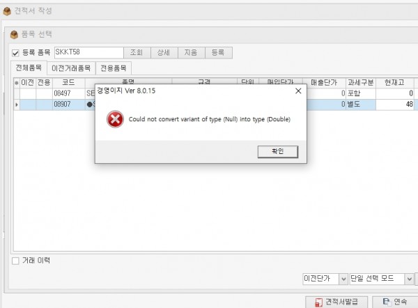 안녕하세요 기존 작성된 견적서나 거래명세서 제품 변경시 이런 메세지가 종종 나오는데