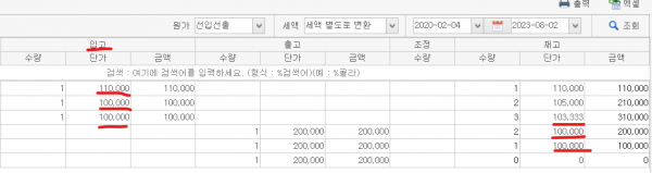 재고 소진시 단가표기(원가)가 순서대로 11만원,10만원,10만원으로 표기되지 않고